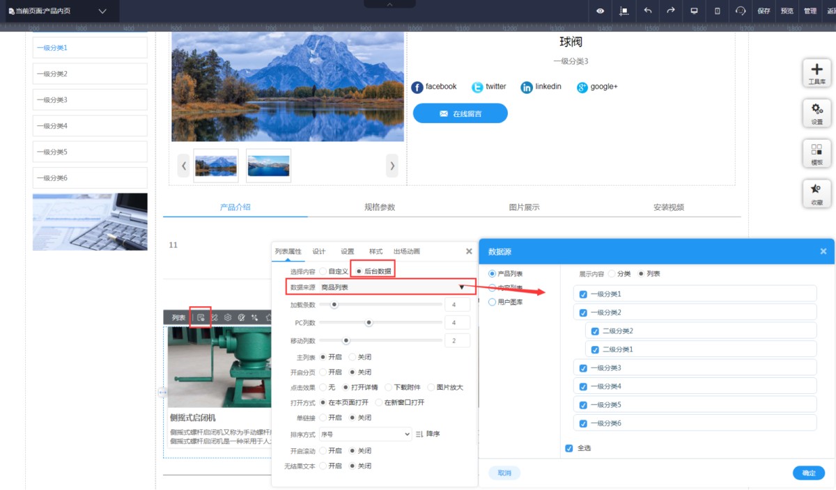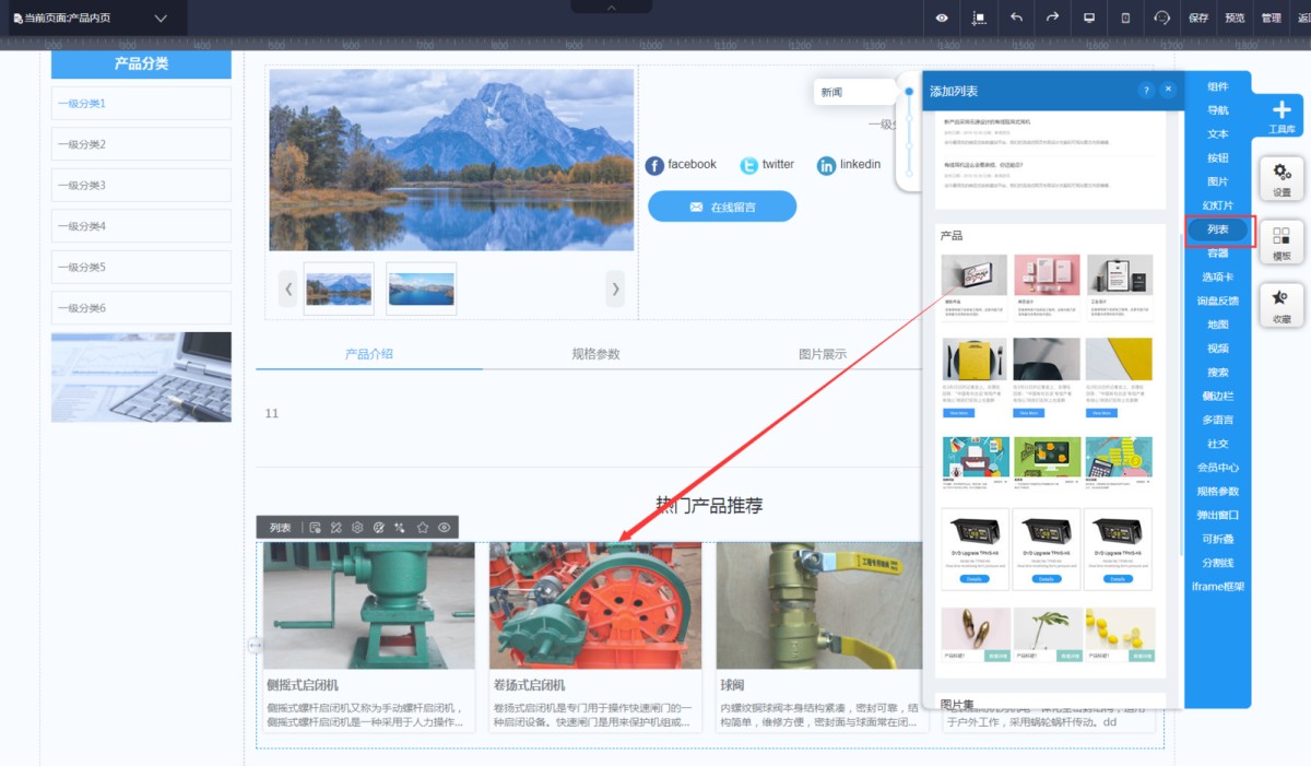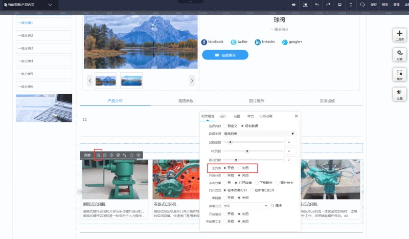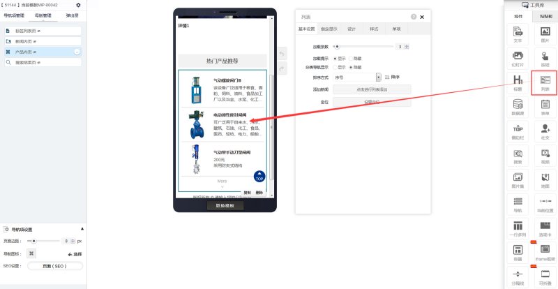 2,在页面上添加一个列表控件,在控件属性-样式里,选择合适的列表样式即可。AMP和MIP的产品内页添加列表时,是默认同类产品推荐的,只显示和当前产品同一分类的其他产品。如同一分类下没有其他产品,则列表不显示。如果不想设置同类推荐,需联系易营宝客服修改。