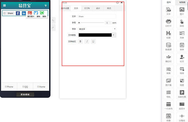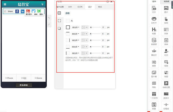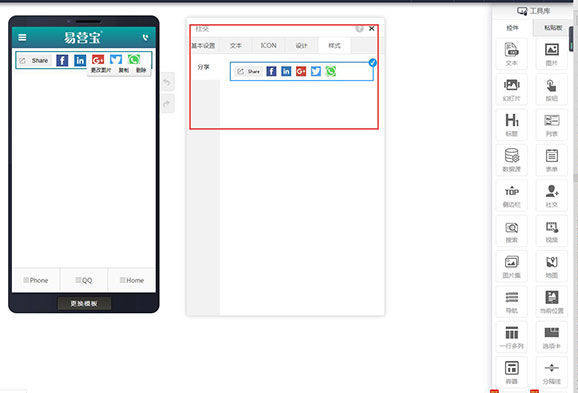 在页面编辑里拖入社交控件,默认显示基本设置,可以设置按钮颜色,图片大小,间距,定位,在页面里选中设计控件,可以更换图片,复制和删除。