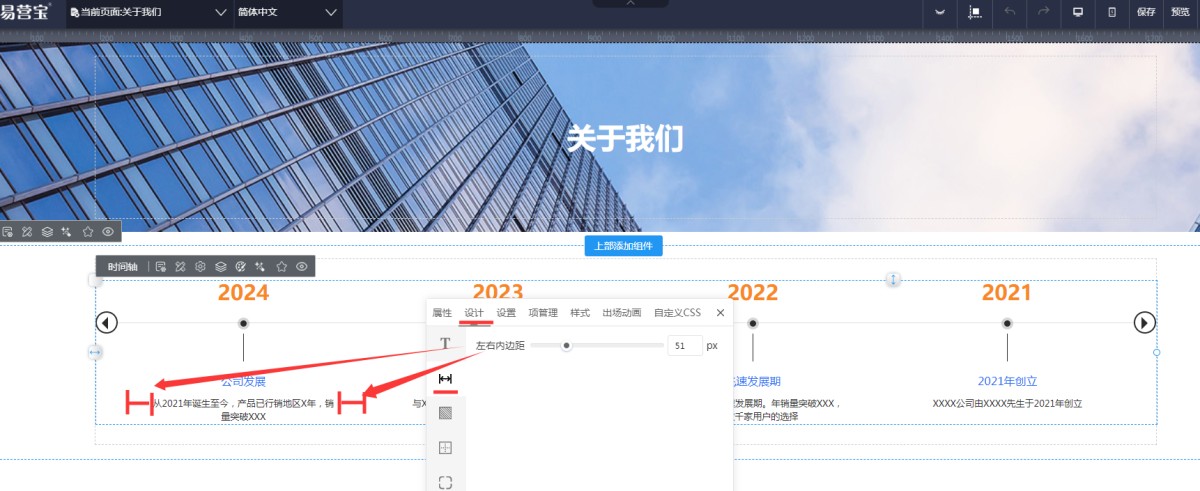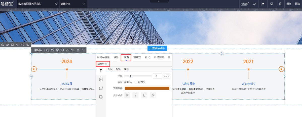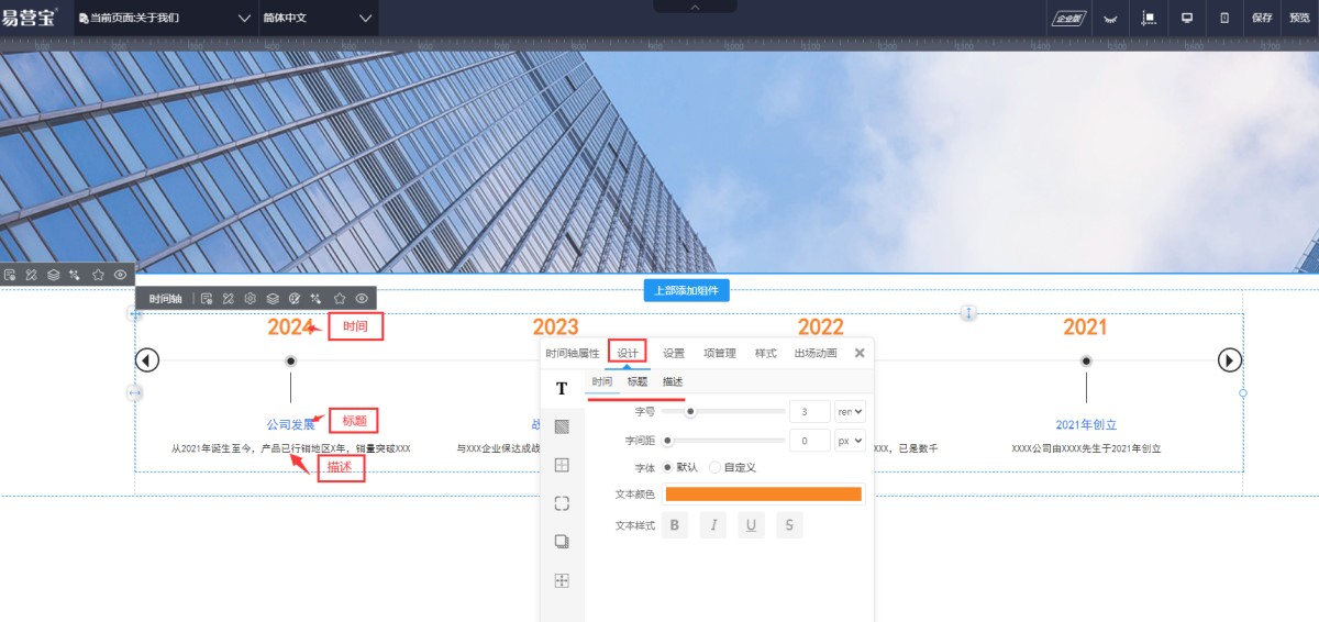 3,在属性设计-文本里,可以设置时间轴上的时间、标题和描述的文本样式,包括颜色、字号、字体等。