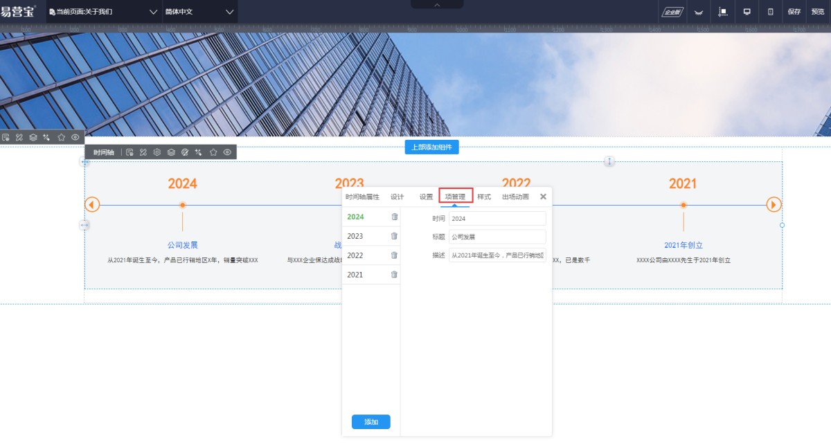 8,在项管理里,可以新增时间轴的项,并设置每一项的日期和文本内容。