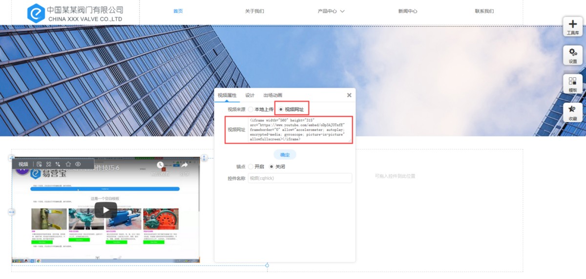 4,选择视频网址时,把从第三方获取的iframe代码添加上,点击确定即可。