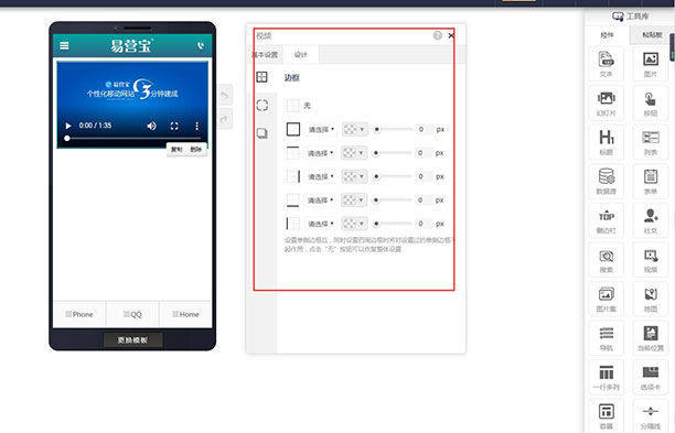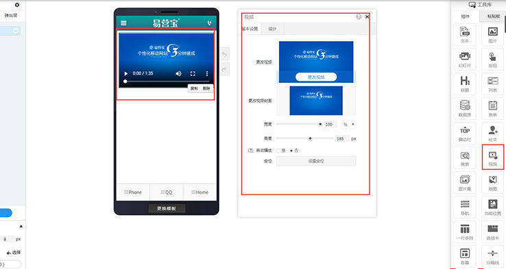 在页面编辑里拖入视频控件,默认显示基本设置,可以更换视频,更换视频封面,视频宽度,视频高度,自动播放,定位,可以复制和删除。