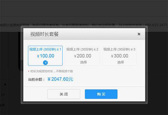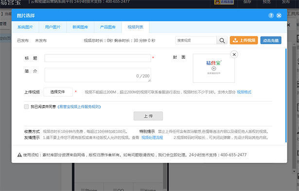 点击更换视频,弹出视频列表界面,点击上传视频可以上传本地视频,需要填写标题,上传视频封面,简介,上传视频文件,然后点击上传,可以点击查看已发布和未发布的视频,新上传的视频需要转码,可以在未发布中看到,视频免费时长是30分钟,超过时长收费。