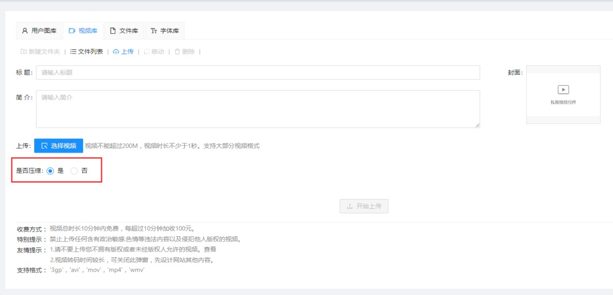 注意:系统默认是压缩视频的,选择不压缩后,可能会影响网站打开速度,所以视频体积最好不要超过3M.