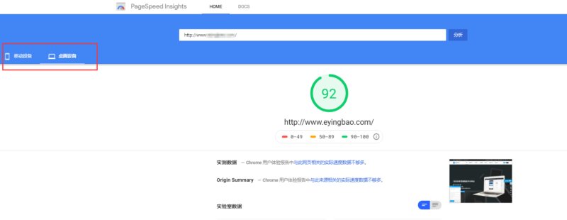 1, PageSpeed检测网站性能时会抓取网址两次,一次是通过移动设备进行分析,另一次是通过桌面设备进行分析。默认展示的得分是移动设备的得分,所以如果你的网站是独立的PC站,那你需要切换到桌面设备上查看网站得分。