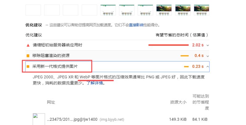 3, 网站的图片使用WebP格式会提高网站的性能得分。WebP 是谷歌推出的适合于 Web 使用的图像格式。在保持同样质量的情况下,可比 JPG 减小 40% 的体积。所以使用WebP格式的图片更有利于提高网站的加载速度。如果你的网站图片使用的不是WebP格式,在PageSpeed的优化建议里,会建议你使用WebP格式对图片进行压缩。