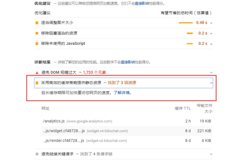 4,网站上如果安装了第三方代码,也可能会影响网站的测试得分。因为网站资源加载后的缓存时间会影响客户下一次访问网站时的加载速度,而第三方代码一般不会设置太长的缓存时间。