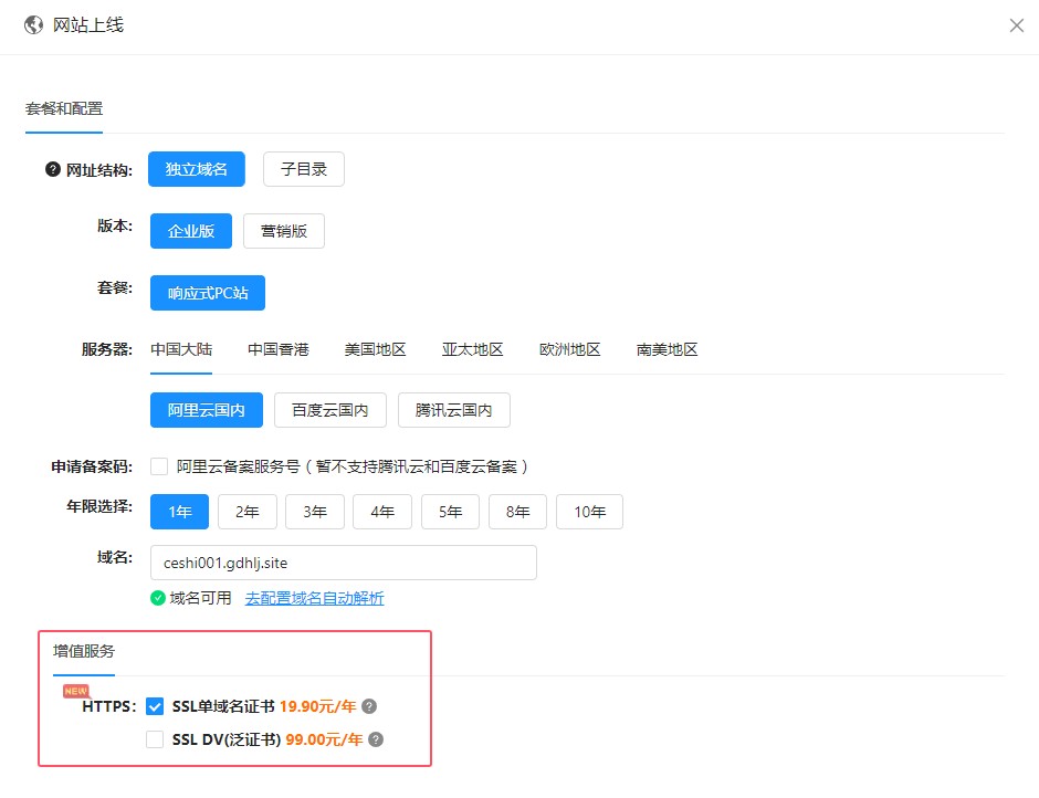 1,在网站上线面板,填写绑定的域名后,在增值服务里会显示证书的选项,可以根据需求选择单域名或泛域名赠书。