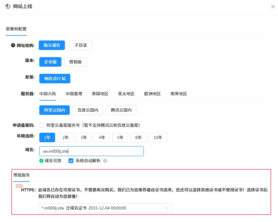 3,如果网站绑定的域名,主域名已经购买了泛域名证书,并且证书未过期,则系统会提示证书可用,无需再次购买,网站上线后,系统会自动安装证书。