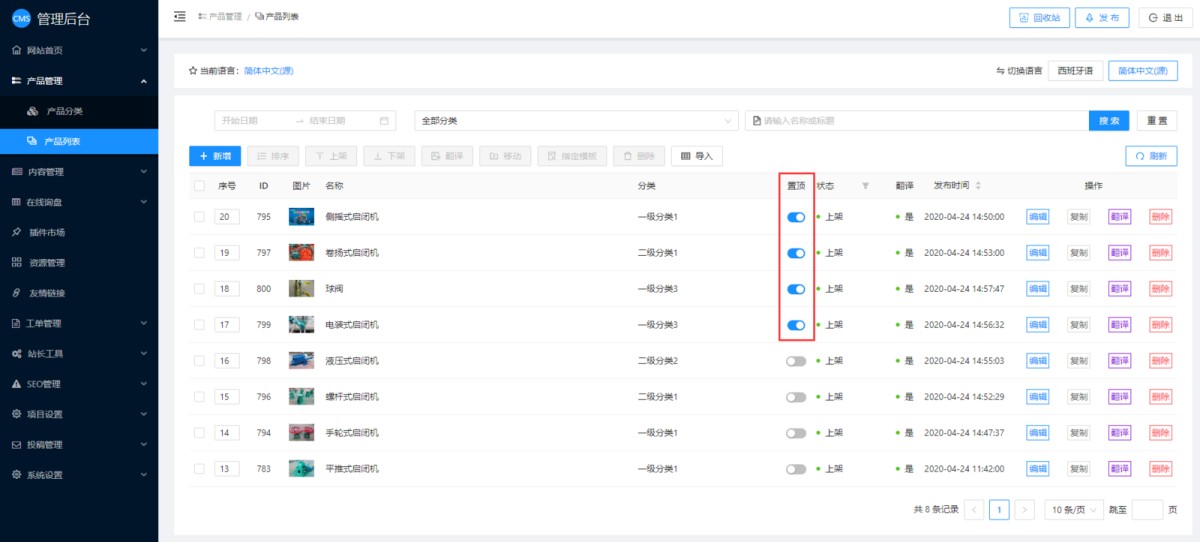 一、直接在管理后台将指定的产品设置置顶。