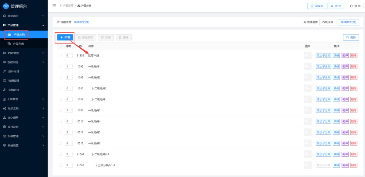 1,在后台产品分类里,新增一个推荐产品的分类,分类名可以自定义,如“推荐产品”。