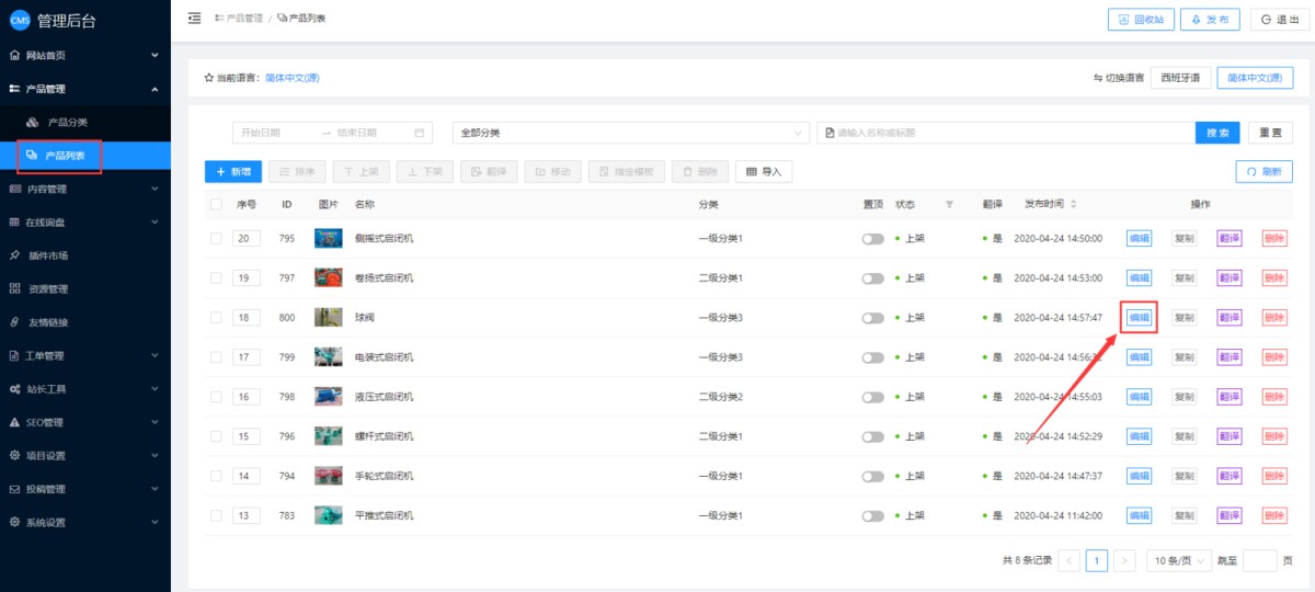 2,在后台产品列表里,找到要推荐的产品,点击编辑按钮,进入产品编辑页面。
