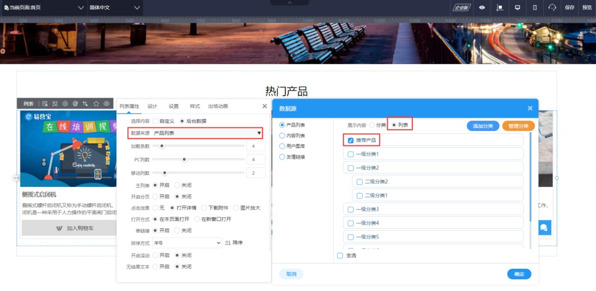 4,在UI编辑页面,产品列表属性里,选择数据源为“推荐产品”这个分类即可。这样列表就只显示“推荐产品”这个分类下的产品了。