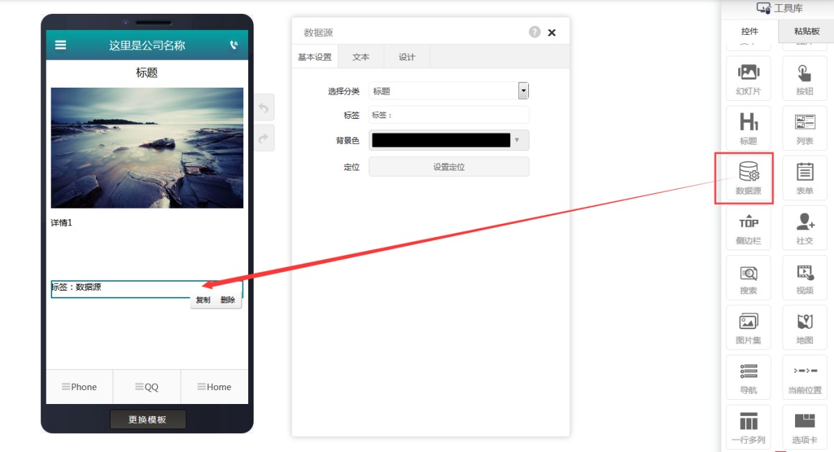 2,如果需要调用其他的内容,可以在从工具库里拖入数据源控件到页面上。