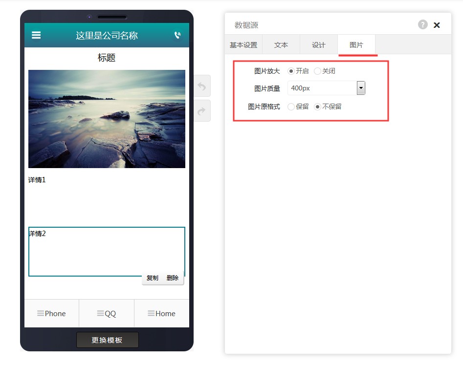 4,在控件属性里,可以对数据内容的样式进行修改。当调用的是详情数据源时,可以在属性里,设置详情里的图片质量。