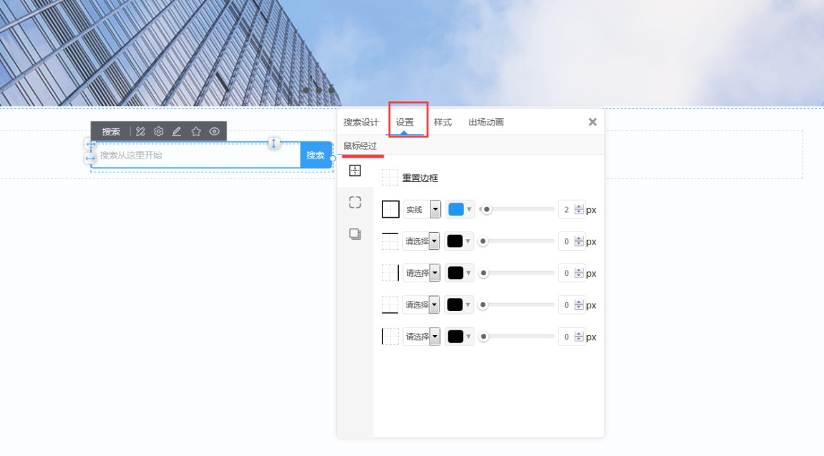 8,在搜索的属性-设置里,可以设置鼠标经过搜索控件时,控件的边框、圆角、阴影。