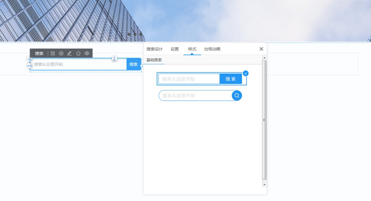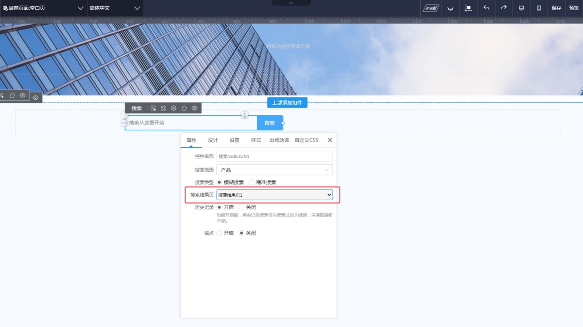 1,在工具库里点击搜索控件,选择合适的样式拖入到页面上。