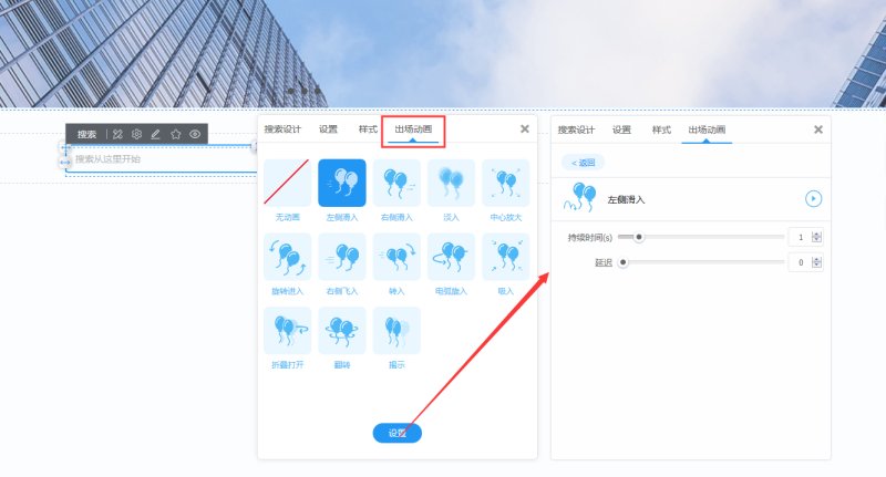 10,在搜索属性-出场动画里,可以为搜索控件设置动画效果。我们提供12种动画效果,并且可以设置动画的持续时间和延迟时间。