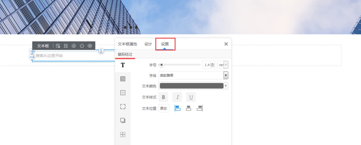 14,在文本框属性-设置里,可以设置鼠标经过文本框时,文本的样式、文本框的背景色、边框、圆角、阴影等。