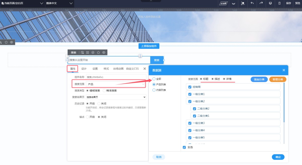 3,在搜索属性里,可以设置搜索范围,先选择搜索的目录,包含搜索产品、搜索新闻、搜索全部(产品+新闻),并且可以选择具体分类。选择完搜索目录后,在选择搜索范围,包含标题、描述、详情。说明:搜索详情的话,范围会太大,一般是设置搜索标题或搜标题+描述。