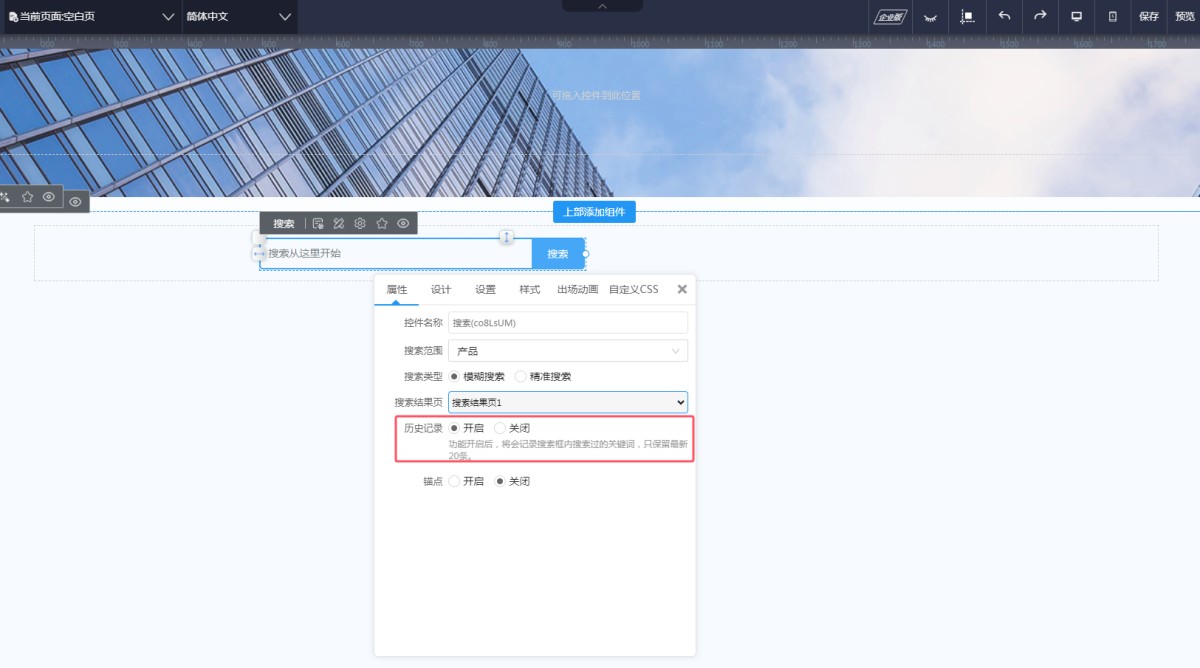 6,在属性里可以开启搜索的历史记录,开启后,会记录搜索过的关键词,可记录最近20条记录。