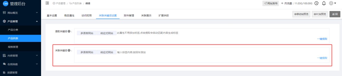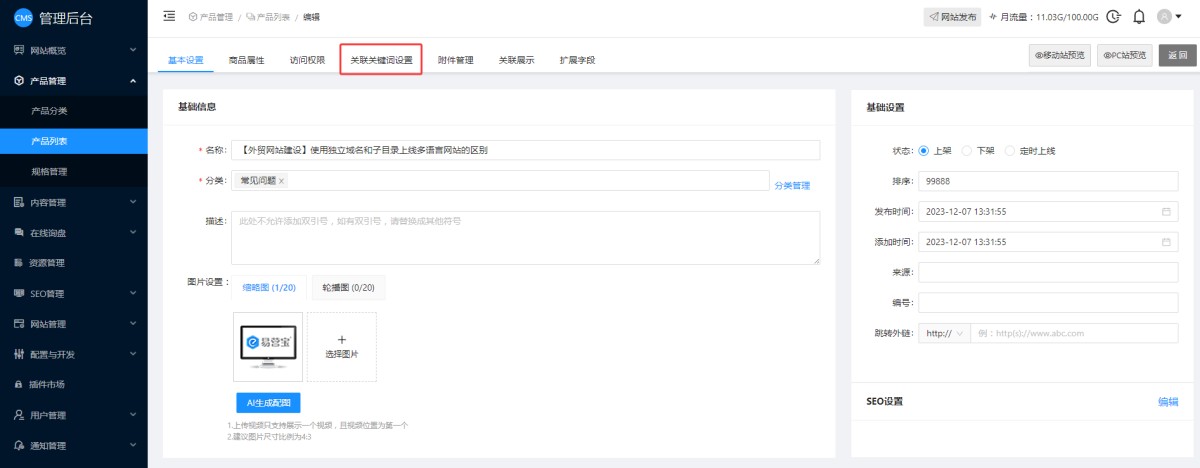 2,进入产品列表-产品编辑里,点击关联关键词设置。
