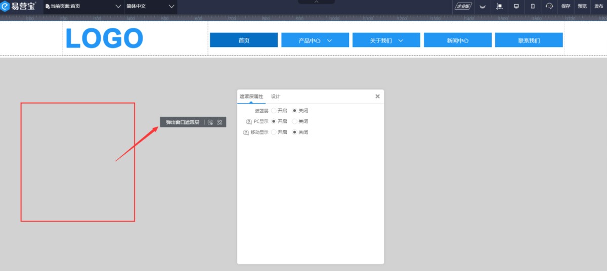 一是遮罩层属性,点击页面空白区域,就可以展示出遮罩层属性。做头部用的弹窗,遮罩层需设置关闭,并行设置不在移动端显示。