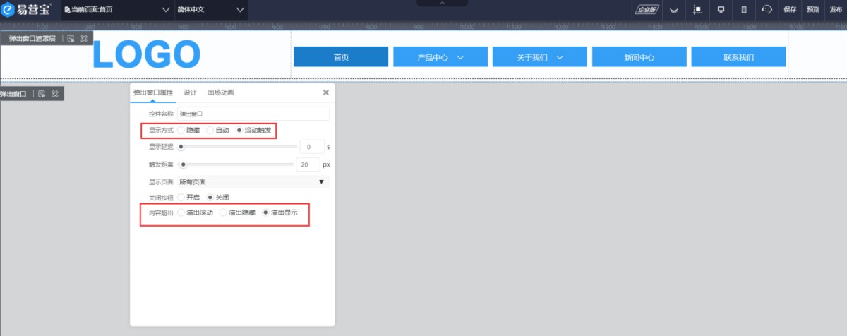 在显示方式这里,如果是前面说的情况一,显示方式应该选自动;如果是情况二,显示方式应该选滚动触发,并设置触发距离。