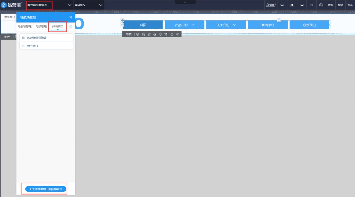 5,修改完成后,在导航项管理-弹出窗口里点击关闭弹出窗口,即可返回编辑页面。