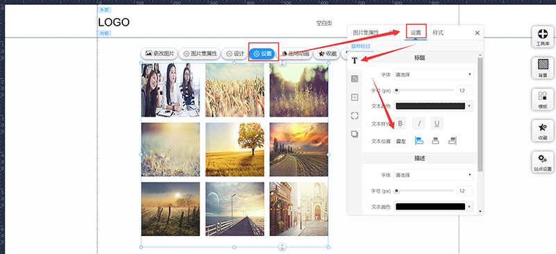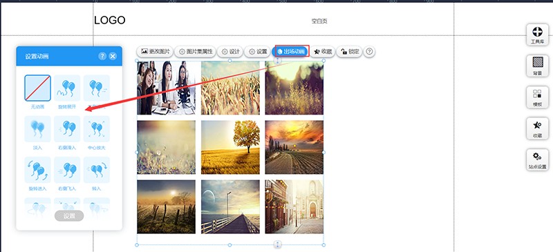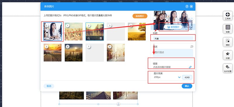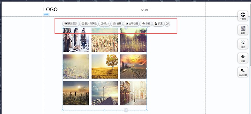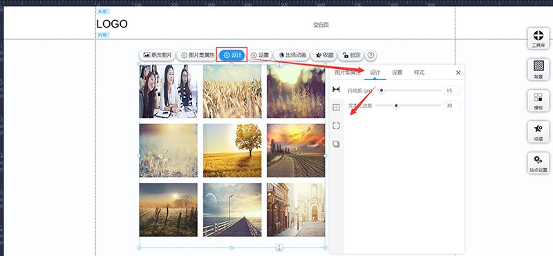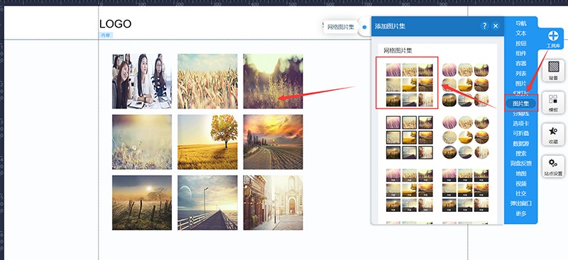 进入网站编辑,找到右上角“工具库”,左键点击“图片集”并拖拽到页面中。其中“图片集”有很多样式,可以根据需要选择自己喜欢的。