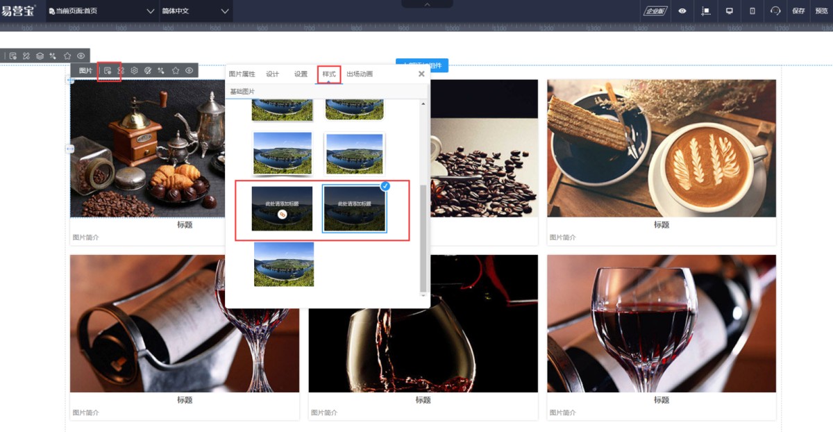 1,列表-图片集控件,在第一个图片的属性-样式里,可以选择带遮罩层的样式。(选择样式后需要保存刷新一下)