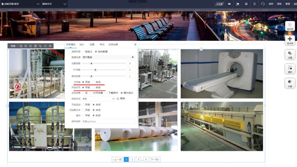 2,如果想开启翻页,那列表属性需要选后台数据源,可以调用后台产品新闻的缩略图,也可以调用后台资源管理里的某个图片文件夹。