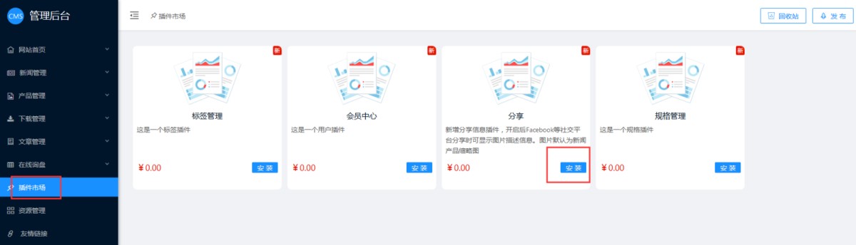 1,进入网站CMS管理后台-插件市场,点击安装分享插件。