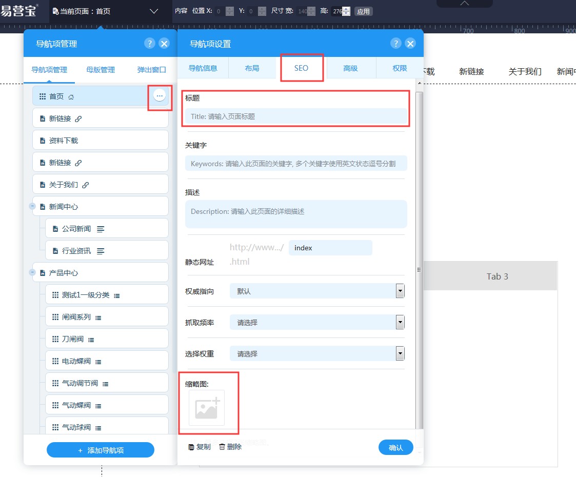 2,分享插件安装后,就可以设置页面分享时的描述和图片了。网站导航页面,分享的描述和图片是在每个导航的设置-SEO里的标题和缩略图。