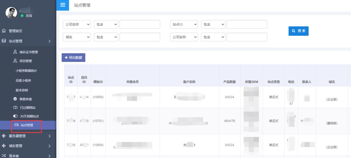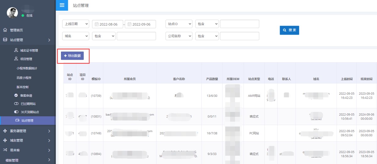 OEM合作伙伴可以在OEM超级管理后台查询和导出某个时间段的网站明细,如过去6个月上线的网站明细、下个季度到期的网站明细等。