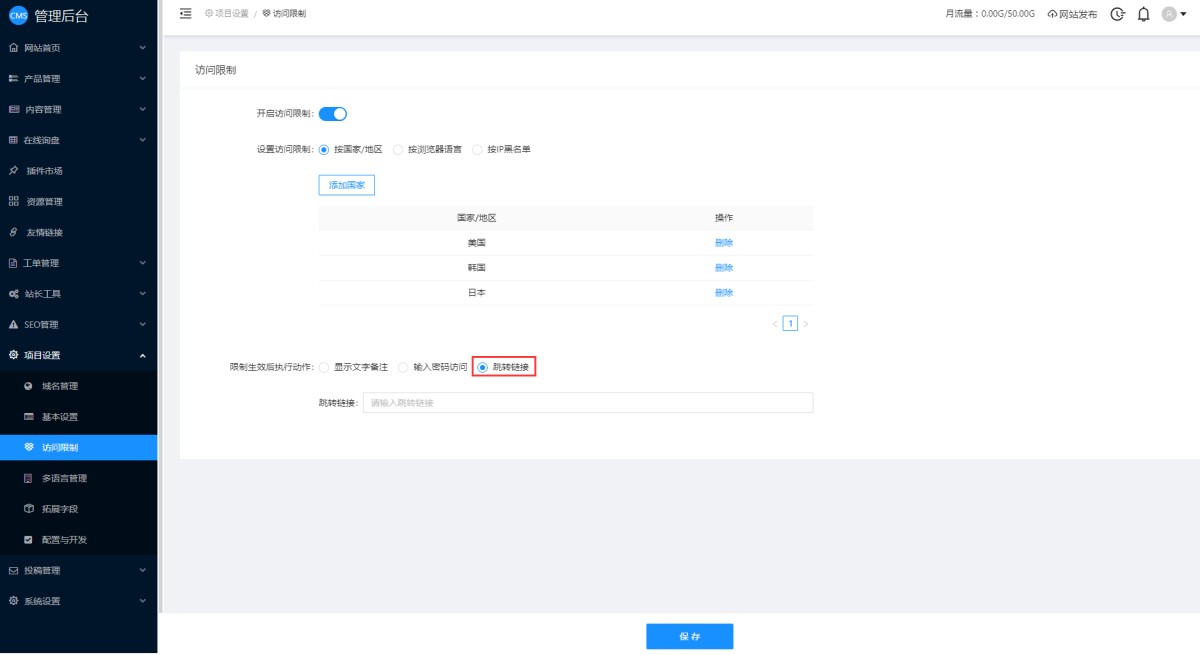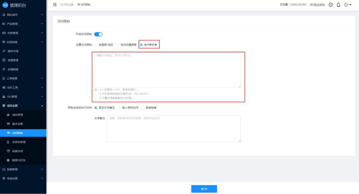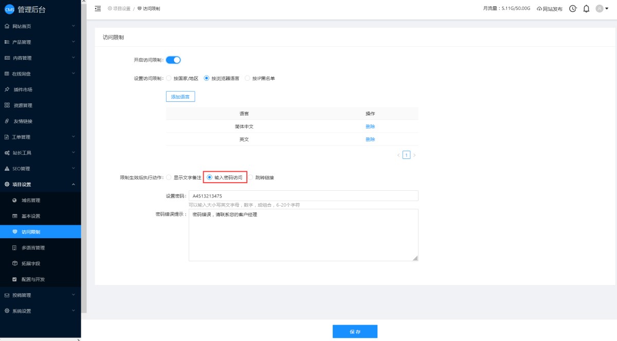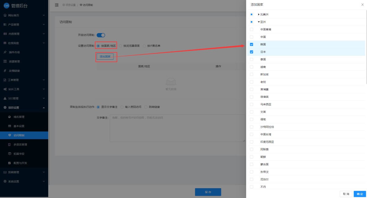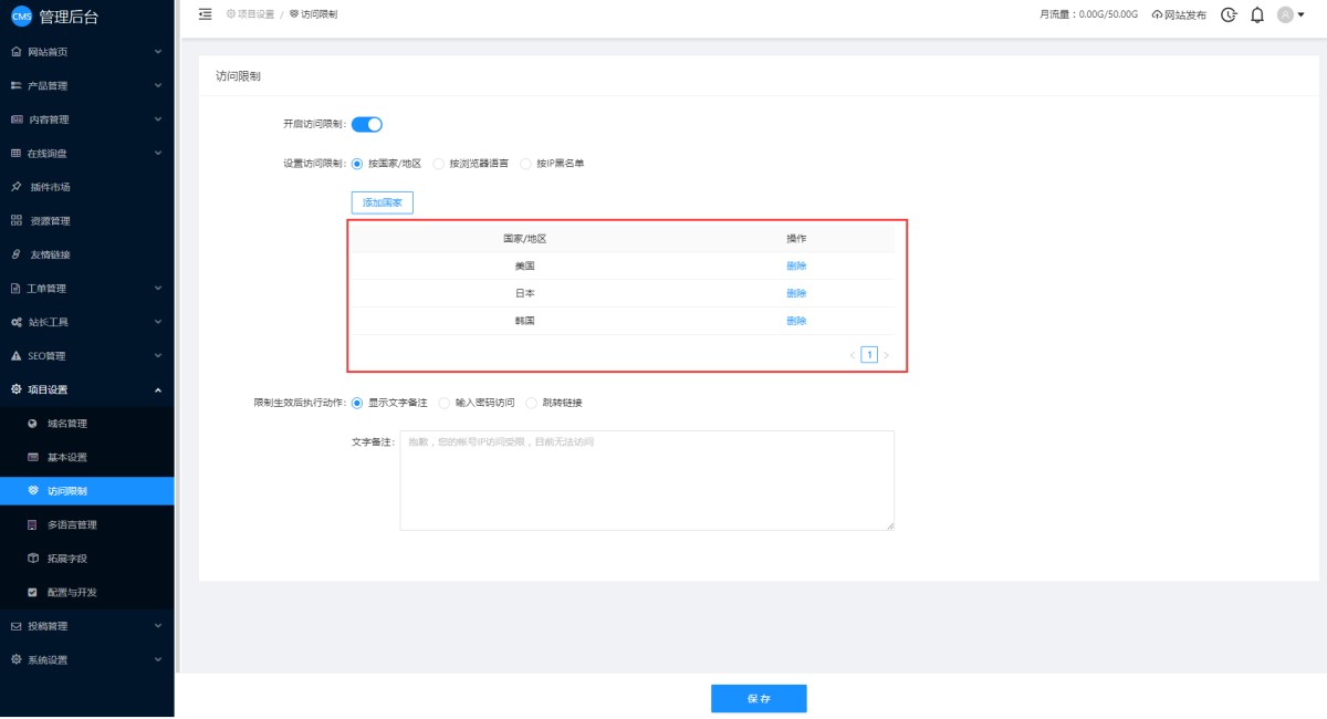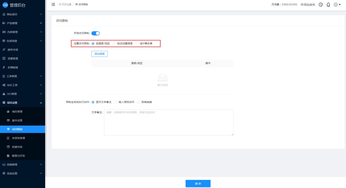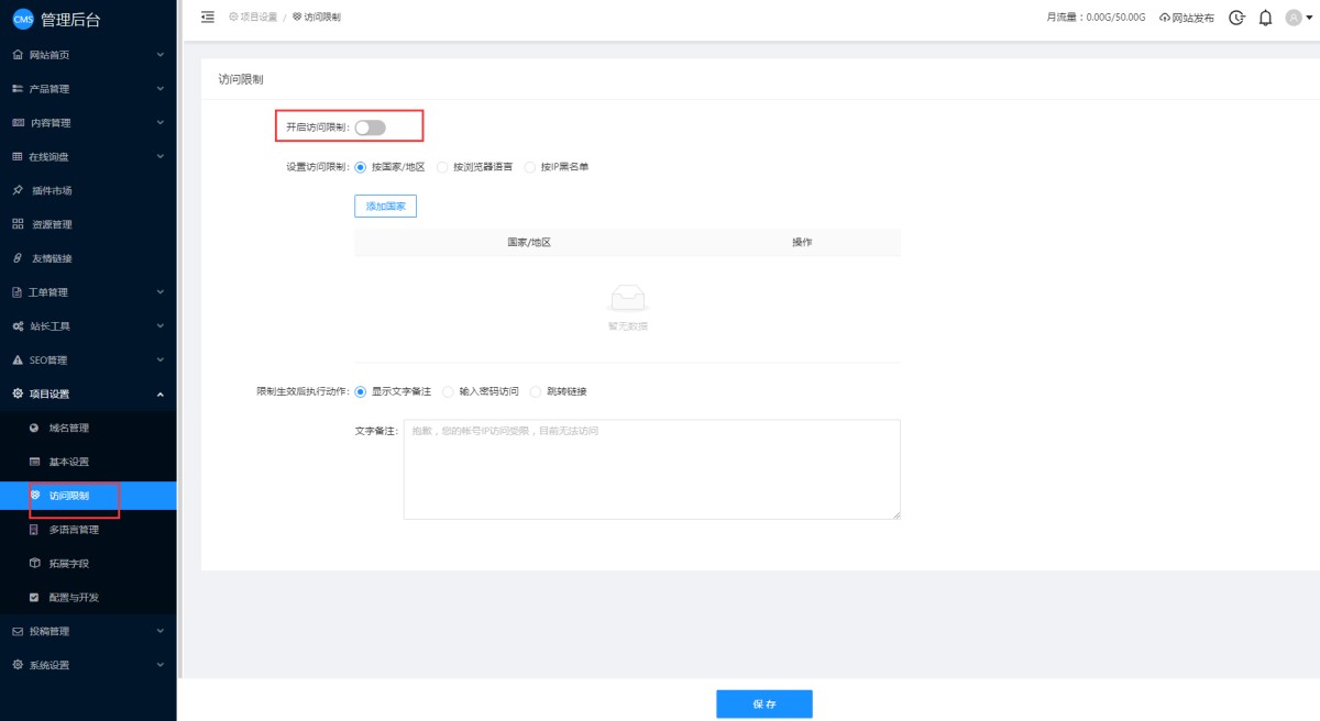 1,在CMS管理后台,项目设置-访问限制里,开启访问限制。