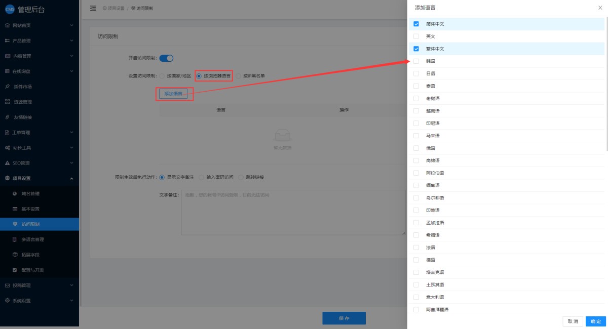 5,选择按浏览器语言限制时,点击添加语言,在弹窗里可以选择需要限制的浏览器语言。例如选择简体中文和繁体中文,那么如果访客使用的浏览器语言如果是中文,则无法访问网站。