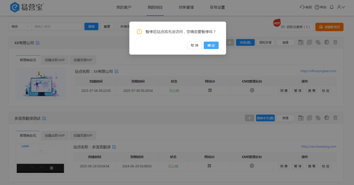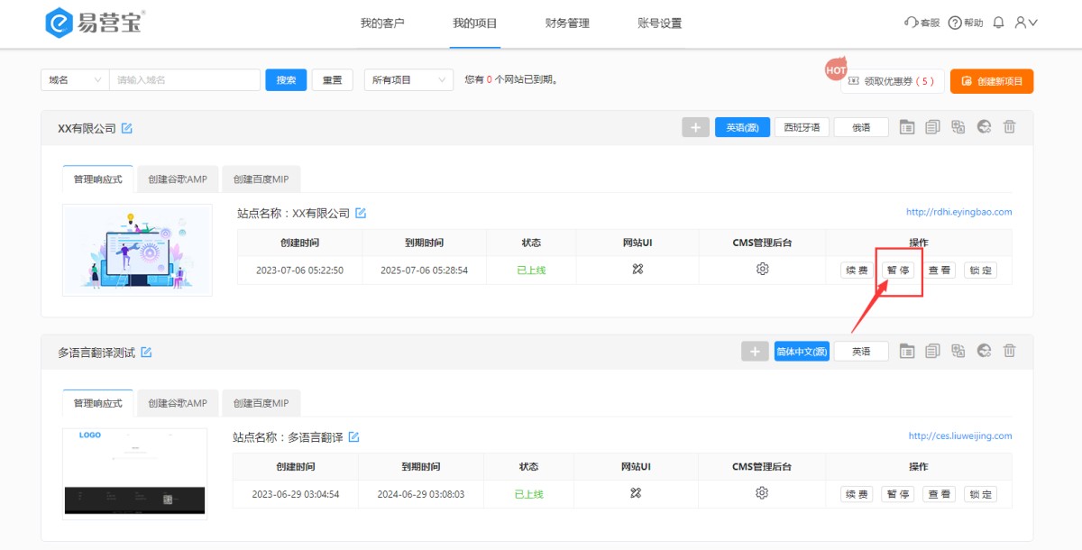 1,在“我的项目”里,找到要暂停的网站,点击暂停按钮。