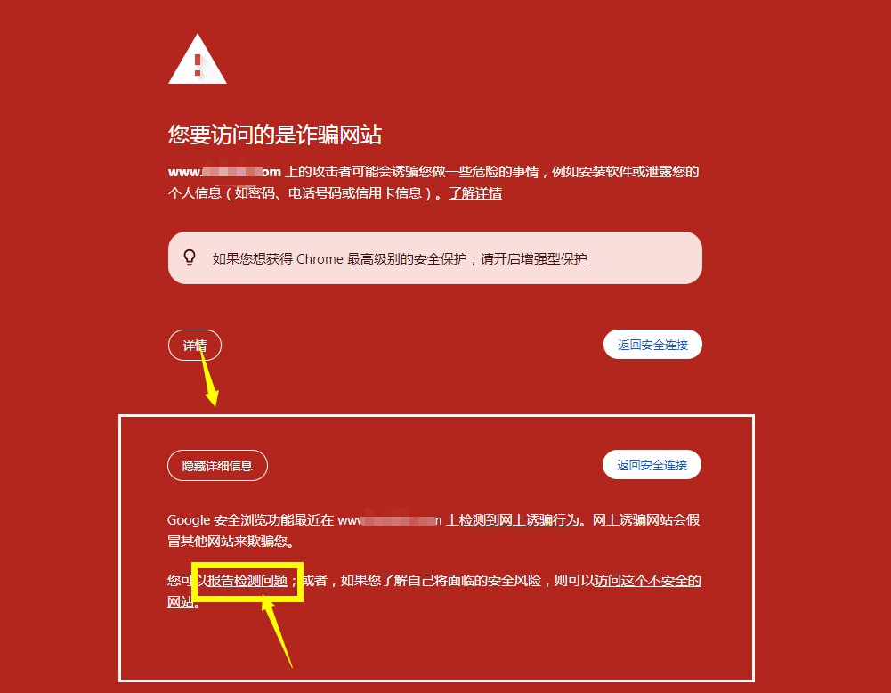 7,如果在谷歌浏览器里打开提示网站是诈骗网站,说明域名被谷歌封了,如果网站无违规内容,可以向谷歌申诉。点击页面上的详情按钮,在展开内容里,点击报告检测问题,提交申诉理由即可。