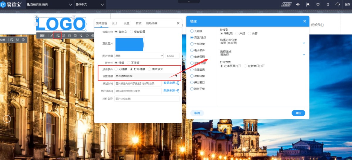 1,点击图片控件,在图片属性里,点击事件选择“打开链接”,然后就可以设置链接了,链接类型包含站内页面、站外链接、联系方式等。