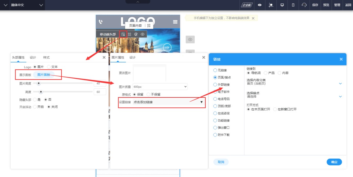 2,点击移动端头部;在头部属性里,点击图片面板;在图片属性里,可以为logo设置链接。