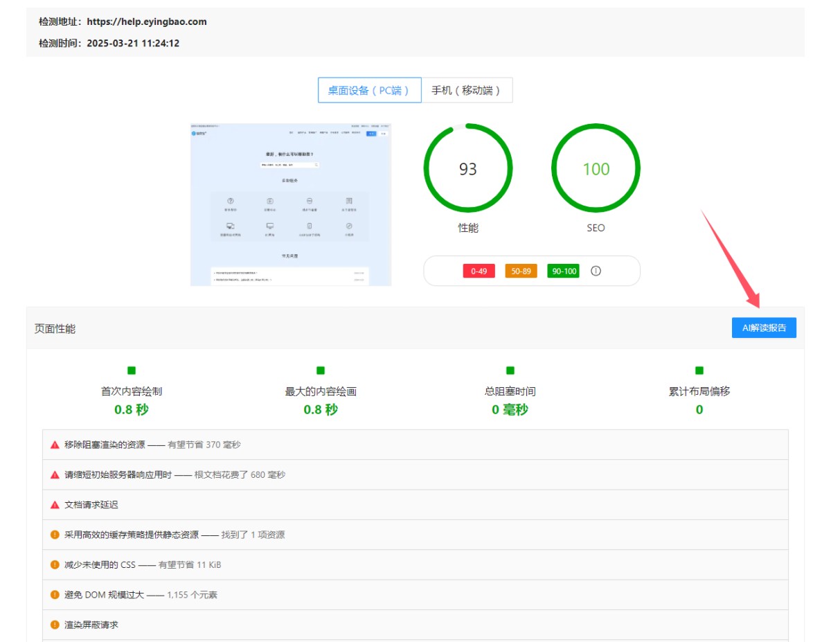 3,检测完成后,会直接跳转到检测结果页面,可以查看网站的性能和SEO的检测结果。并且系统提供AI解读报告的功能。