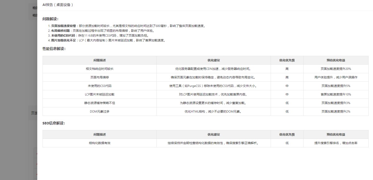 4,点击“AI解读报告”后,在弹窗里会展示AI解读后的信息。方便用户更直接的了解网站的问题和优化建议。