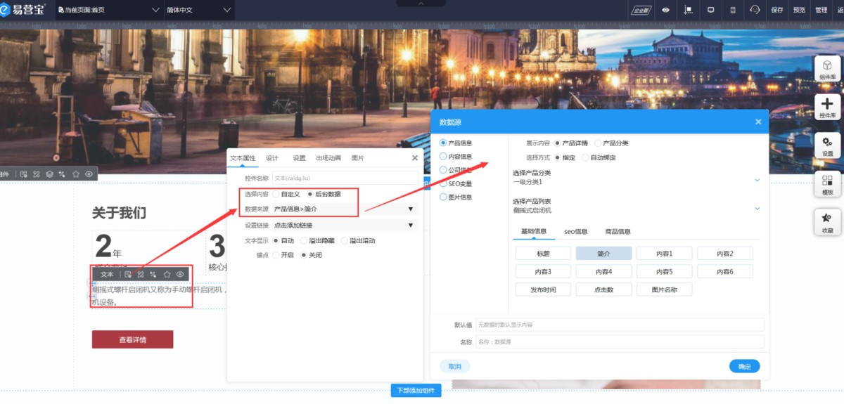 1,在文本控件属性里,有个选择内容,如果选择的是后台数据,可以点击数据来源,看下该文本控件具体调用的后台哪个数据,然后去cms管理后台对应修改内容就可以。