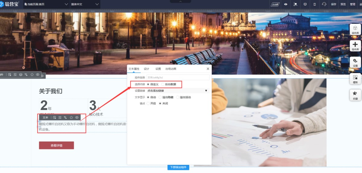 3,选择自定义后,文本控件的属性里会显示一个小铅笔的图标,这个就是修改文本的。(如果没显示出来,可以点右上角的保存,再刷新一下)