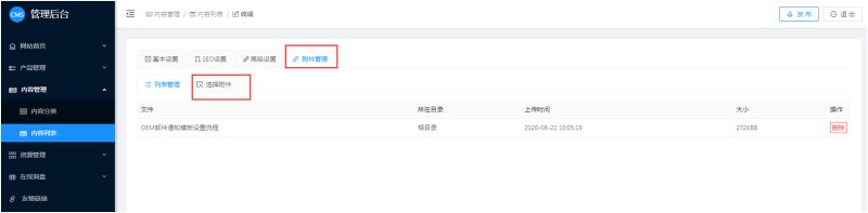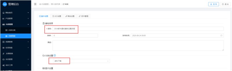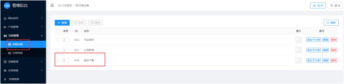 1,在管理后台产品或内容管理里创建一个下载分类。例如在内容管理里创建一个“资料下载”分类。