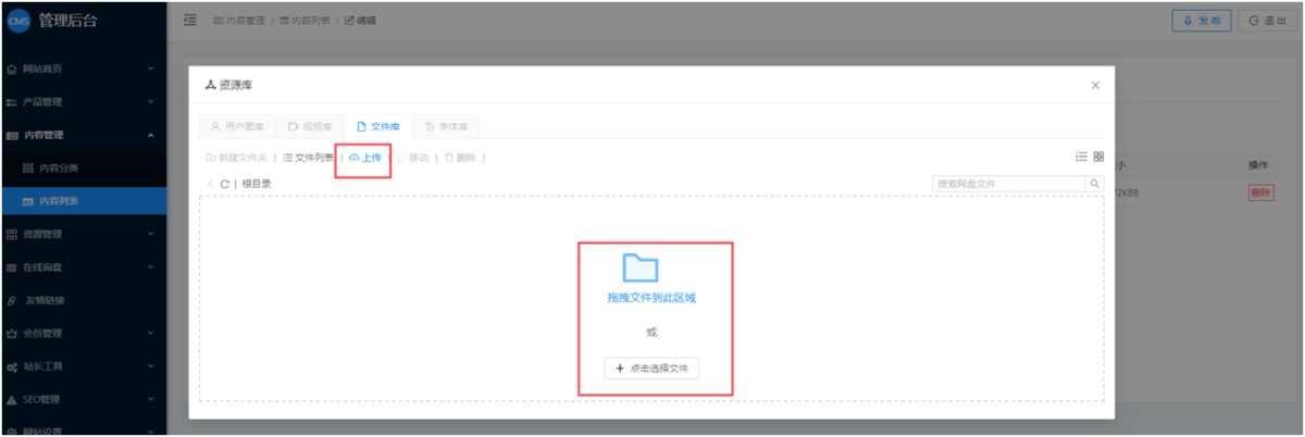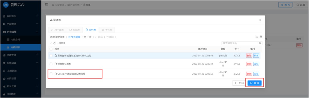 6,上传完成后,系统会自动跳转到文件列表页面。选择上传的文件,点击确定。(1篇内容只能选一个文件)