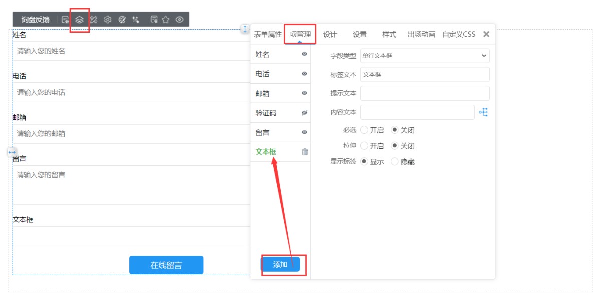 1,在表单属性向管理里,点击添加一个新的文本框。