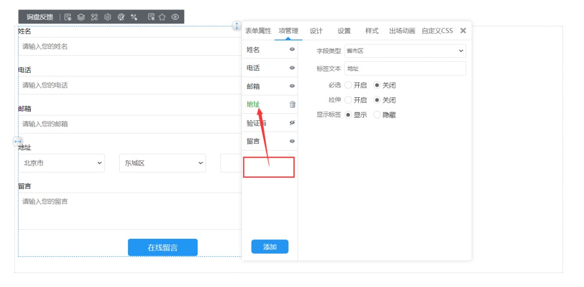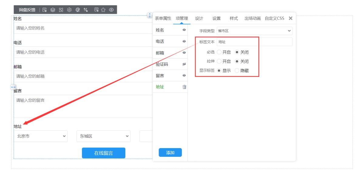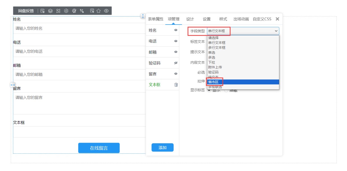 2,在文本框属性-字段类型里,选择省市区。