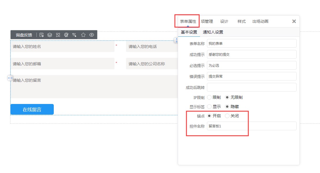 1,在询盘反馈属性里,开启锚点,并为控件设置一个名称,这个控件名称不会在页面上显示,只是用来区分页面上的锚点的。开启锚点后,留言板就相当于是一个锚点了。